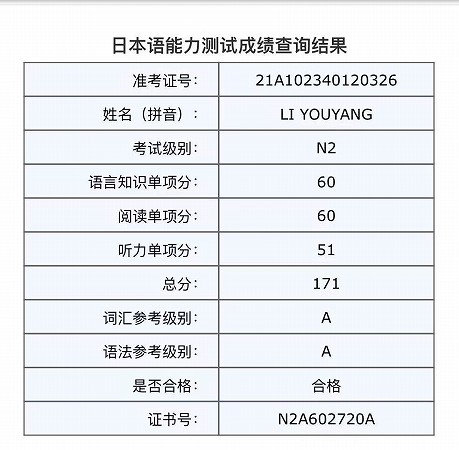 李悠扬同学通过日语N2考试