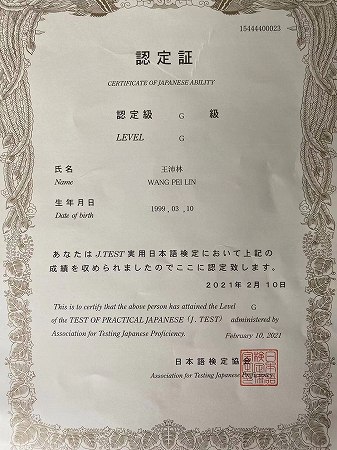 王沛林达到日本语鉴定考试G级